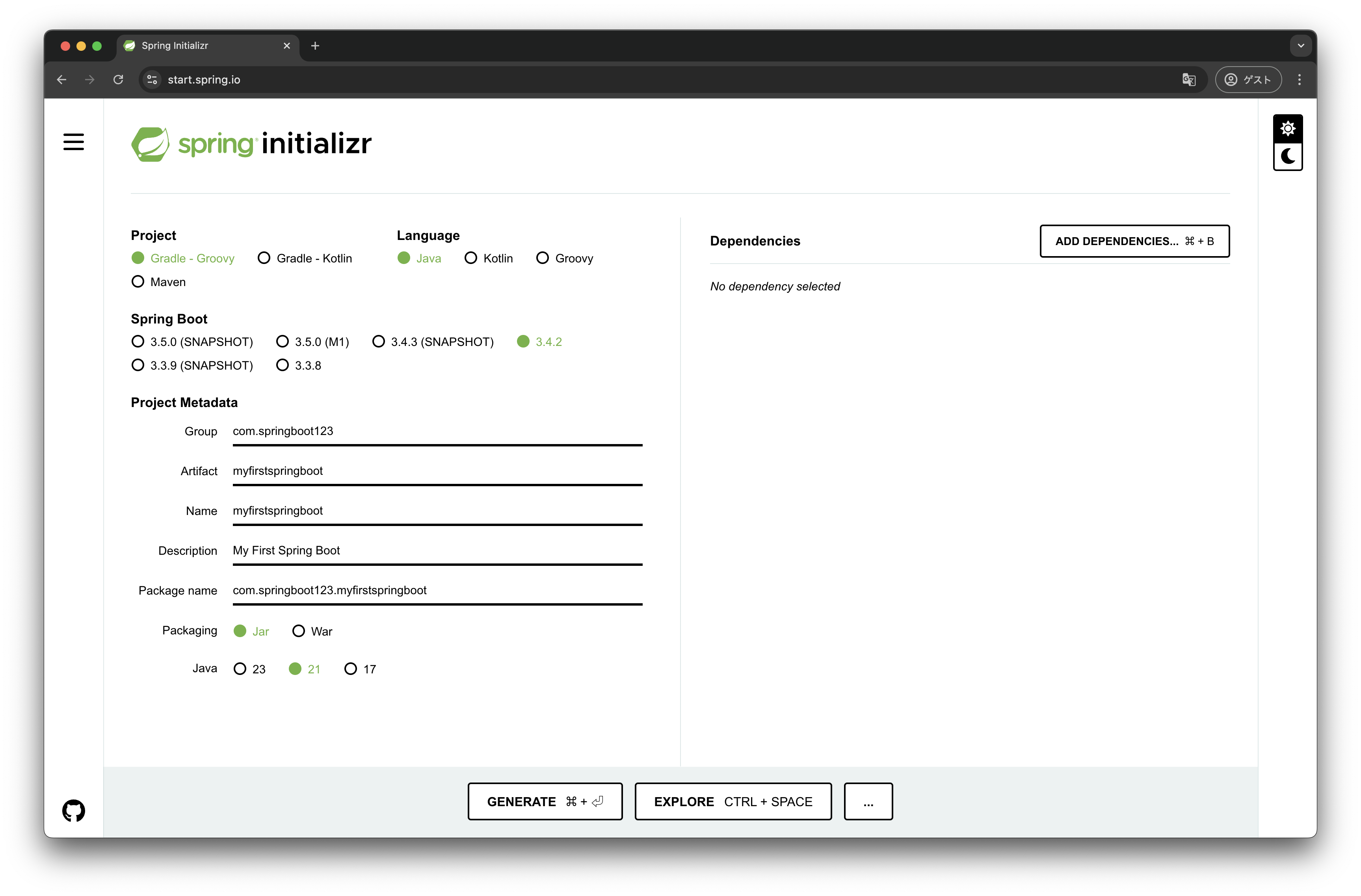 早速spring initializrにアクセスしてみましょう!以下のようなサイトが表示されるはずです。
