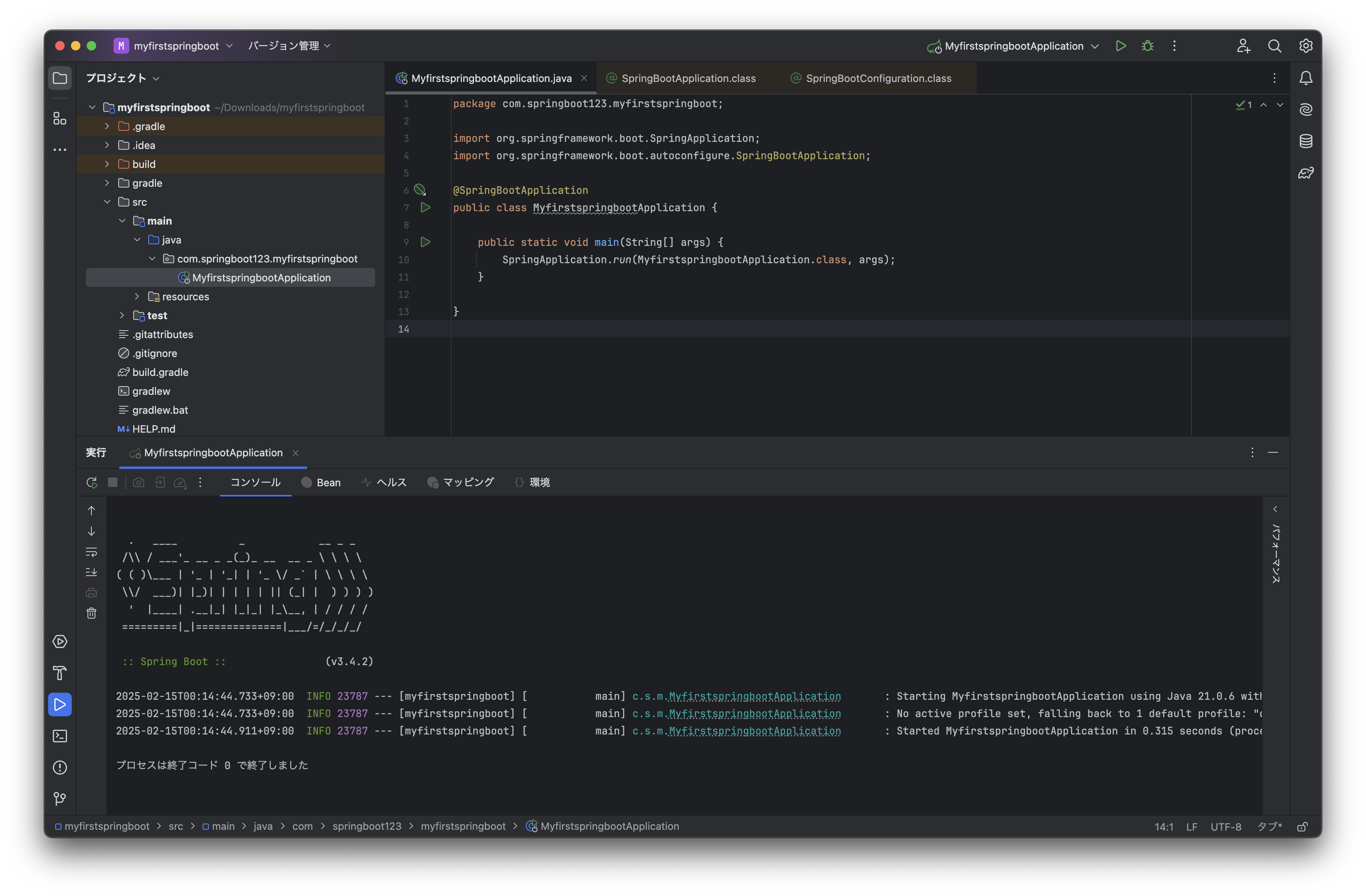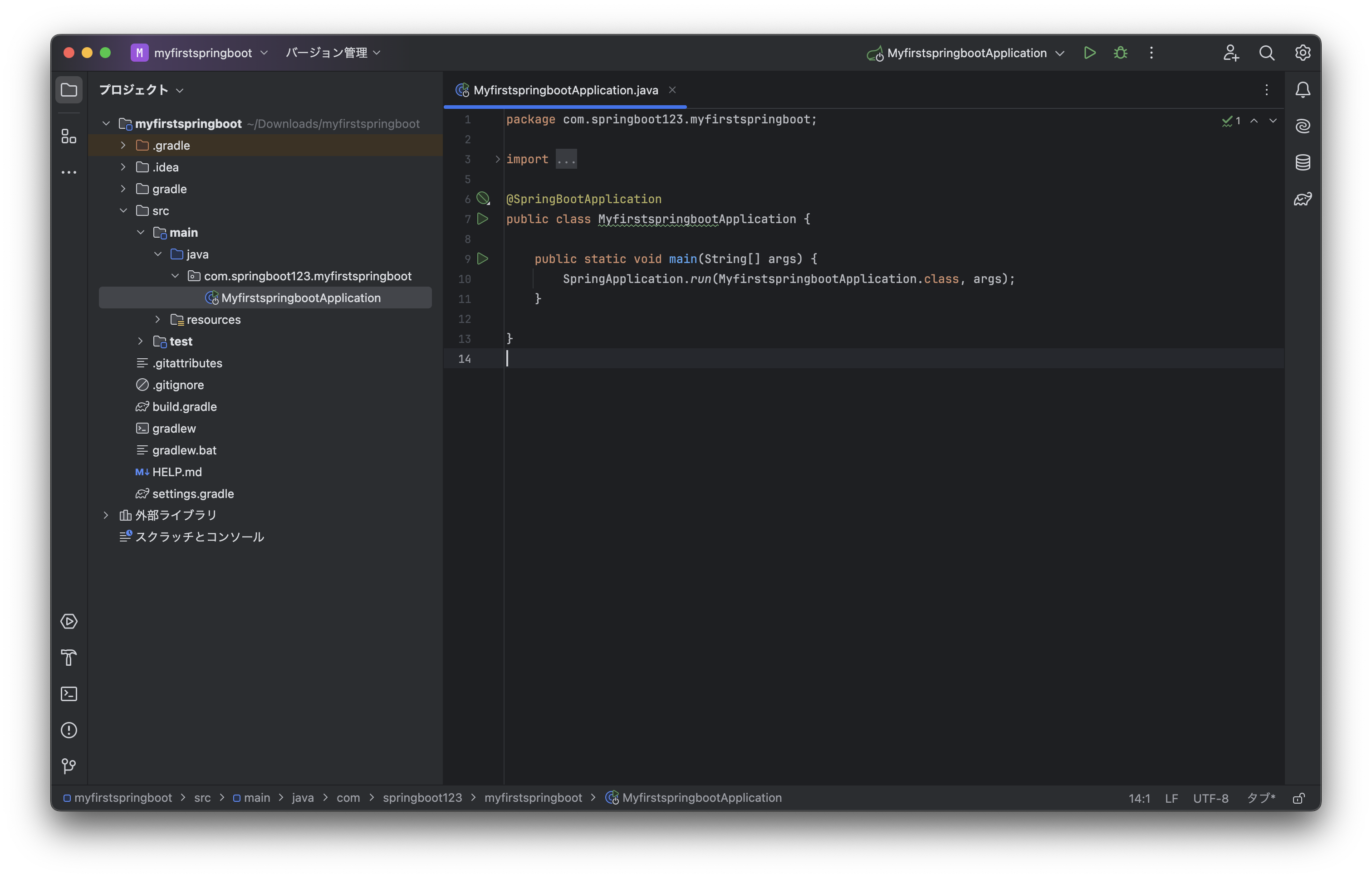 src/main/java/com/springboot123/myfirstspringboot/MyfirstspringbootApplication.javaを探して開いてみましょう。